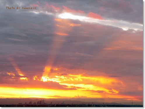 今日も光の筋が空高く伸びて行く様子が感動的な夕焼けを